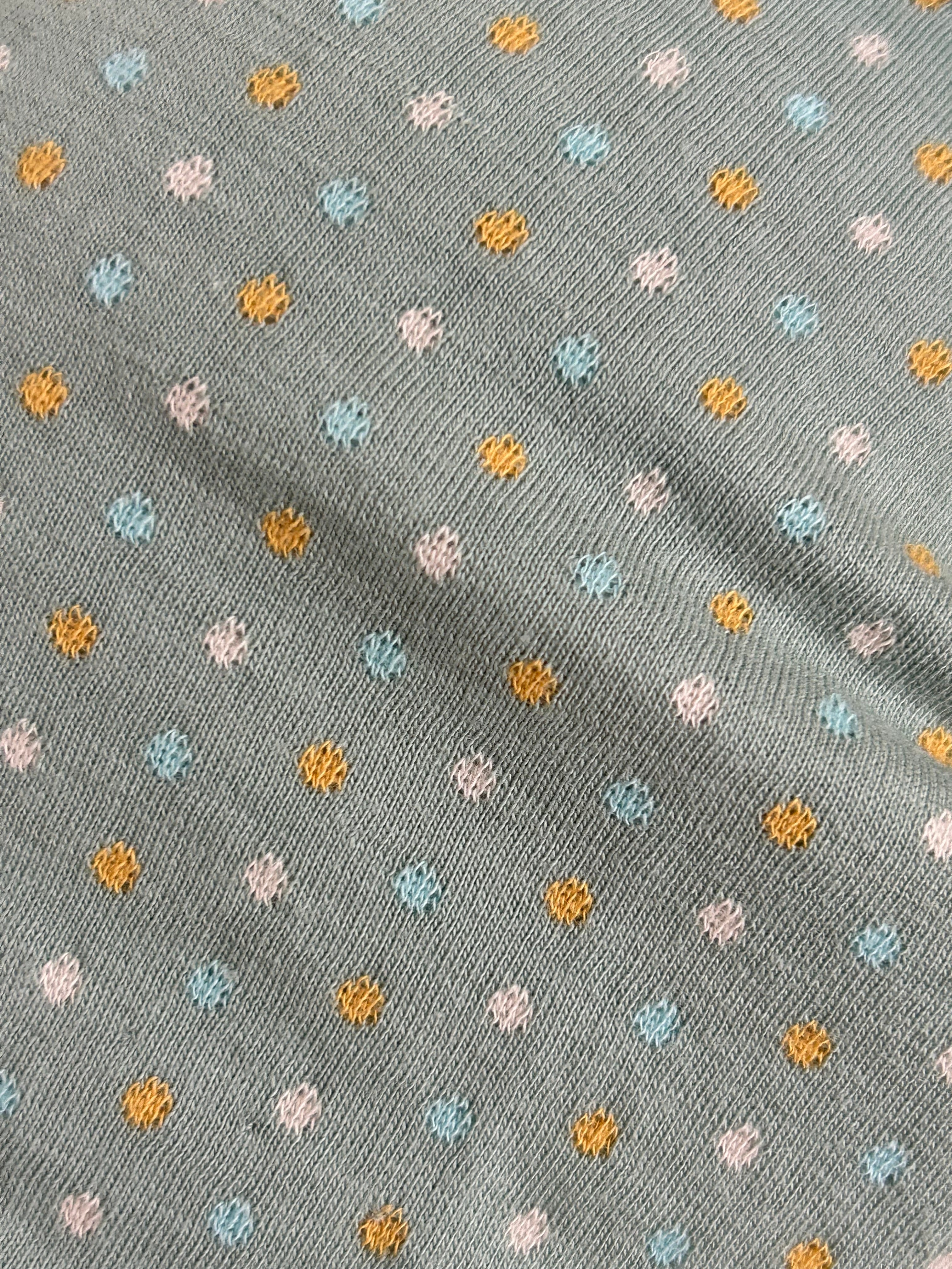 グリーンにオレンジや白のドットが映えるデザインです!コットン100%の素材感は肌触りが良く、日常使いにもおすすめです。